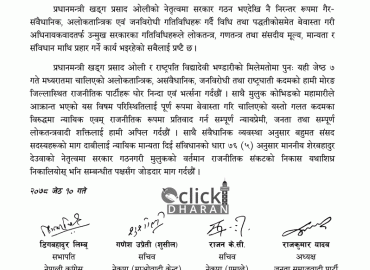 धरान: प्रधानमन्त्री केपी शर्मा ओलीको सिफारिशमा राष्ट्रपति विद्यादेवी भण्डारीले प्रतिनिधिसभा विघटन गरेको विरोधमा सुनसरीका विभिन्न ७ राजनीतिक दलले संयुक्त प्रेश वक्तव्य जारी गरेको छ । संयुक्त वक्तव्यमा हस्ताक्षर गर्नेहरुमा नेपाली कांग्रेसका जिल्ला सभापति राजु कोइराला, नेकपा माओवादी केन्द्रका अध्य ...