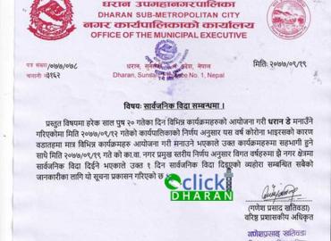 धरान: धरान उपमहानगरपालिकाले धरान डे को अवसरमा भोली सार्वजनिक विदा दिने निर्णय गरेको छ । भोली सोमबार धरान डे को अवसरमा सार्वजनिक विदा दिने बारे आज कार्यवाहक नगर प्रमुखस्तरीय निर्णय भएको वरिष्ठ प्रशासनकीय अधिकृत गणेशप्रसाद खतिवडाले जानकारी दिएका छन् । उनका अनुसार कोभिड १९ को कारण धरान डेमा यसबर्ष वडा ...