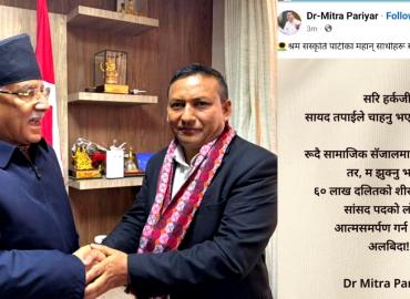 धरान: श्रम सस्कृती पार्टीको उपाध्यक्षबाट निलम्बित डा।मित्र परियार नेपाली कम्युनिस्ट पार्टीमा प्रवेश गरेका छन् ।आज शुक्रबार बिहान पार्टी संयोजक पुष्प कमल दाहाल ूप्रचण्डूले परियारलाई स्वागत गर्दै पार्टी प्रवेश गराएका हुन् । उक्त पार्टीमा परियारलाई केन्द्रिय सदस्य दिने बताइएको छ । परियारले श्रम सस ...