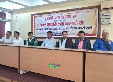 धरान: सुनसरी उद्योग वाणिज्य संघको आयोजनामा नेपाल सुनचाँदी कला व्यवसायी संघका व्यवसायीहरुलाई लक्षित गरि कर तथा लेखा सम्बन्धी आधारभुत शिक्षा कार्यक्रम सम्पन्न भएको छ । प्रशिक्षण कार्यक्रम सुनसरी उद्योग वाणिज्य संघको आफनै भवनमा बिहिबार सम्पन्न भएको हो । प्रशिक्षण कार्यक्रमका प्रशिक्षक बि.एन एसोसिय ...