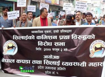 धरानः कपडा सिलाईमा कमिशन प्रथा अन्त्य नभएको भन्दै धरानका सिलाई व्यवसायीहरुले विरोध जुलुस निकालेका छन् । नेपाल कपडा तथा सिलाइ व्यवसायी महासंघ, प्रदेश १ समन्वय समितिको आह्वानमा सोमबार धरानमा विरोध जुलुस भएको हो । धरान १२ स्थित पब्लिक हाइस्कुलबाट निस्किएको विरोध र्याली भानुचोक लोकतान्त्रिक चौतारीसम्म ...