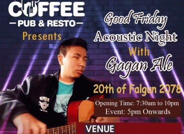 धरान: धरानका १९ बर्षीय गायक गगन आलेले धरान १० स्थित कफी पव एण्ड रेष्टोमा प्रस्तुती दिने भएका छन् । उनले शुक्रवार साँझ ७ बजेदेखि साढे ९ बजेसम्म प्रस्तुति दिने कफि पव एण्ड रेष्टोका संचालक शिसिर राईले जानकारी दिए । उनले नेपाली, हिन्दी र अग्रेजी गीत गरि डेढ दर्जन गीत गाउनेछन् । गगनले विगतमा धरानमा ...