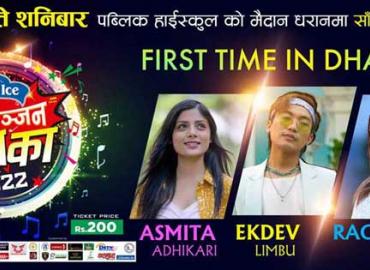 धरान: आज साँझ धरानमा नेपाल आइस मनोरञ्जन धमाका २०२२ हुदैछ । धरान १२ स्थित पब्लिक हाईस्कुलको मैदानमा आज साँझ हुने धमाकामा अहिलेका लोकप्रिय गायक गायिकाहरु एकदेव लिम्बु , रचना रिमाल र अस्मिता अधिकारी एकसाथ आउदैछन् । सिल्भर इन्टरटेन्मेन्टको प्रस्तुती रहेको कार्यक्रम साँझ साढे पाँच बजेदेखि शुरु हुने ...
