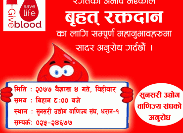 धरान: देशव्यापी लकडाउनको कारण वीपी कोइराला स्वास्थ्य विज्ञान प्रतिष्ठान स्थित नेपाल रेडक्रस सेसाइटीको ब्लड बैंकमा रगतको चरम अभाव भएपछि सुनसरी उद्योग वाणिज्य संघले वृहत रक्तदान कार्यक्रमको तयारी गरेको छ। प्रतिष्ठानको डायलाइसिस, प्रसुतिका बिरामी र शल्यक्रियाका लागि रगत अभाव भइनै रहेको कारण संघले बैशा ...