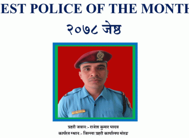विराटनगर: मोरङको नगर प्रहरी कार्यालय विराटनगर कार्यरत प्रहरी जवान राजेश कुमार यादव जेठ महिनाको सर्वोत्कृष्ट प्रहरी घोषित भएका छन् ।यादवलाई १ नम्बर प्रदेश प्रहरी कार्यालय विराटनगरले सर्वोत्कृष्ट प्रहरी घोषणा गरेको हो । अपराधिक कार्यमा संलग्न फरार प्रतिवादीहरुलाई पक्राउ गरी अपराध अनुसन्धानको क्षेत्रमा ...